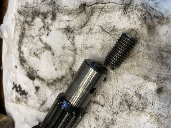 Hier eine abgerissene Antriebswelle eines Einachsmähers. Das Gewinde welches eigentlich über eine Mutter eine Feder für die Überlastkupplung vorspannt, ist bei einer Blockade des Mähbalkens abgerissen.